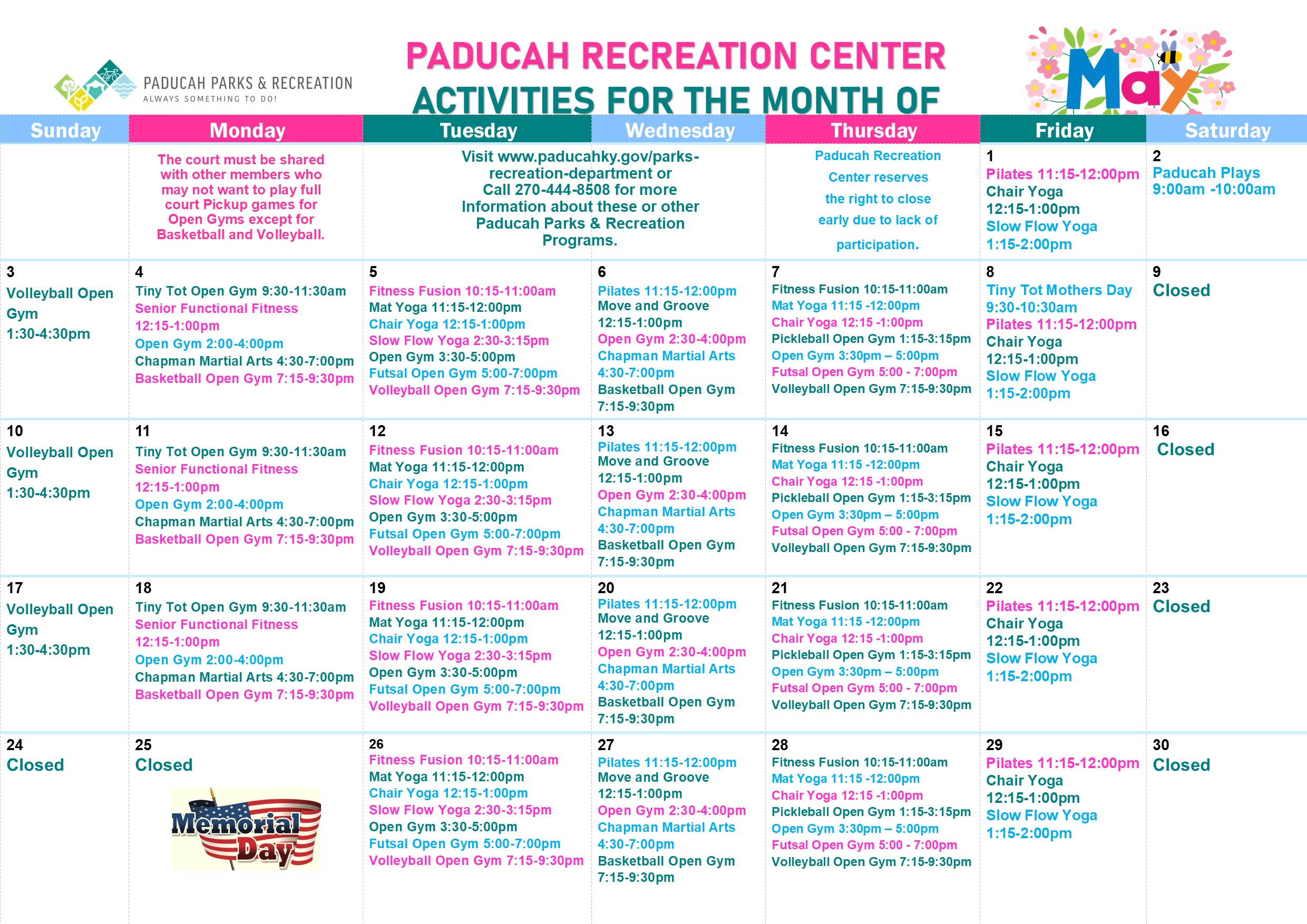 - Paducah parks & Recreation is not responsible for lost or stolen items.